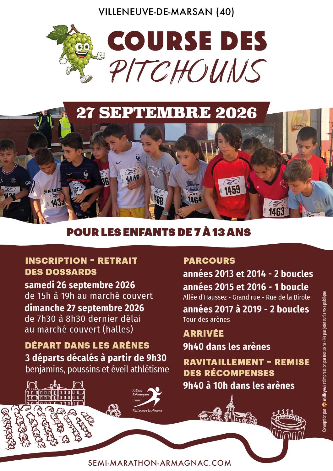 Les dossards sont à retirer sous le marché couvert aux allées d’Haussez à Villeneuve-de-Marsan le samedi 26 septembre de 15h à 19h et le dimanche 27 septembre de 7h30 à 8h30 dernier délai.